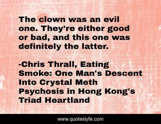 This page presents the quote "The clown was an evil one. They’re either good or bad, and this one was definitely the latter.". Author of this quote is Chris Thrall, Eating Smoke: One Man's Descent Into Crystal Meth Psychosis in Hong Kong's Triad Heartland. This quote is about drugs, chris-thrall, hong-kong, eating-smoke, memoir, biography, crystal-meth,.