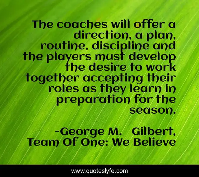 This page presents the quote "The coaches will offer a direction, a plan, routine, discipline and the players must develop the desire to work together accepting their roles as they learn in preparation for the season.". Author of this quote is George M. Gilbert, Team Of One: We Believe. This quote is about team-direction, confidence, football, success, positive, motivational, winning, coaching, optimistic,.