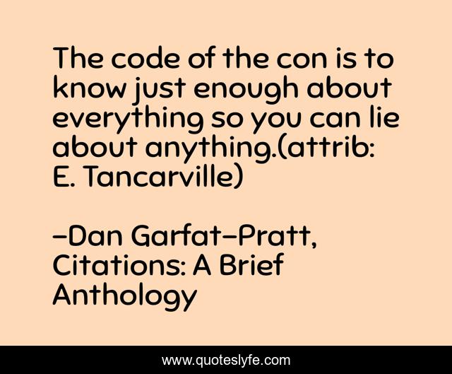 This page presents the quote "The code of the con is to know just enough about everything so you can lie about anything.(attrib: E. Tancarville)". Author of this quote is Dan Garfat-Pratt, Citations: A Brief Anthology. This quote is about confidence, knowledge, con-men, conning, truth, lying,.