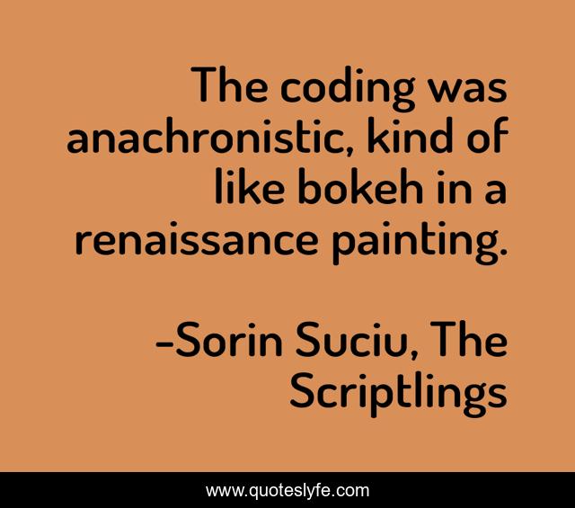This page presents the quote "The coding was anachronistic, kind of like bokeh in a renaissance painting.". Author of this quote is Sorin Suciu, The Scriptlings. This quote is about humor, geeks, coding, geek, comedy, geek-humor,.