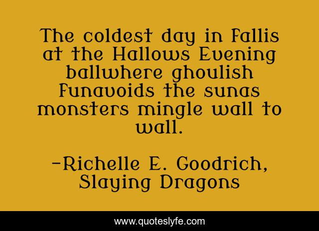 This page presents the quote "The coldest day in fallis at the Hallows Evening ballwhere ghoulish funavoids the sunas monsters mingle wall to wall.". Author of this quote is Richelle E. Goodrich, Slaying Dragons. This quote is about hallows-eve, halloween-poem, richelle-e-goodrich, halloween, richelle, richelle-goodrich,.