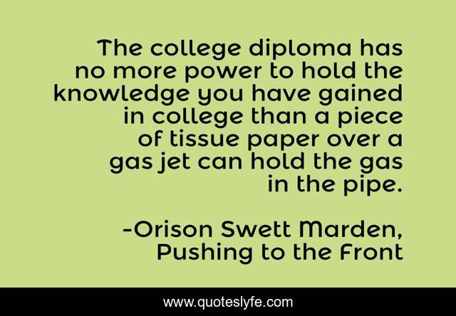 This page presents the quote "The college diploma has no more power to hold the knowledge you have gained in college than a piece of tissue paper over a gas jet can hold the gas in the pipe.". Author of this quote is Orison Swett Marden, Pushing to the Front. This quote is about life, education, college, diplima,.