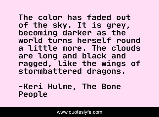 This page presents the quote "The color has faded out of the sky. It is grey, becoming darker as the world turns herself round a little more. The clouds are long and black and ragged, like the wings of stormbattered dragons.". Author of this quote is Keri Hulme, The Bone People. This quote is about clouds, dragons, sky, nature,.