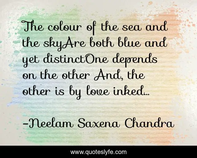 This page presents the quote "The colour of the sea and the skyAre both blue and yet distinctOne depends on the other And, the other is by love inked…". Author of this quote is Neelam Saxena Chandra. This quote is about blue, sky, sea,.