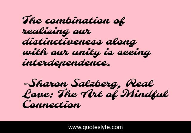 This page presents the quote "The combination of realizing our distinctiveness along with our unity is seeing interdependence.". Author of this quote is Sharon Salzberg, Real Love: The Art of Mindful Connection. This quote is about love, distinctiveness, unity, awareness, interdependence, real-love, affection,.