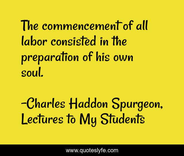 This page presents the quote "The commencement of all labor consisted in the preparation of his own soul.". Author of this quote is Charles Haddon Spurgeon, Lectures to My Students. This quote is about discipleship, ministry, prayer,.