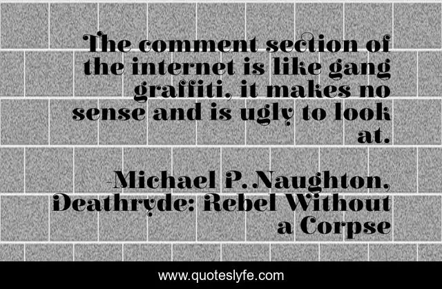 This page presents the quote "The comment section of the internet is like gang graffiti, it makes no sense and is ugly to look at.". Author of this quote is Michael P. Naughton, Deathryde: Rebel Without a Corpse. This quote is about opinions, abuse, words-of-wisdom, internet,.