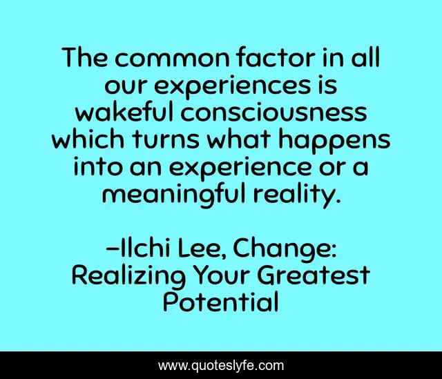 This page presents the quote "The common factor in all our experiences is wakeful consciousness which turns what happens into an experience or a meaningful reality.". Author of this quote is Ilchi Lee, Change: Realizing Your Greatest Potential. This quote is about enthusiasm, inspirational, self-development,.