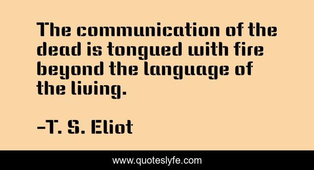 This page presents the quote "The communication of the dead is tongued with fire beyond the language of the living.". Author of this quote is T. S. Eliot. This quote is about fire, living, language,.