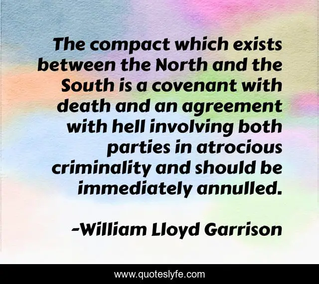 This page presents the quote "The compact which exists between the North and the South is a covenant with death and an agreement with hell involving both parties in atrocious criminality and should be immediately annulled.". Author of this quote is William Lloyd Garrison. .