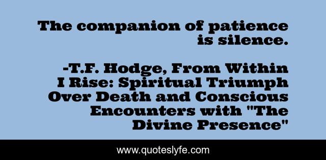 This page presents the quote "The companion of patience is silence.". Author of this quote is T.F. Hodge, From Within I Rise: Spiritual Triumph Over Death and Conscious Encounters with "The Divine Presence". .