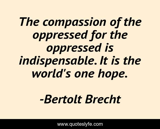 This page presents the quote "The compassion of the oppressed for the oppressed is indispensable. It is the world's one hope.". Author of this quote is Bertolt Brecht. This quote is about compassion, oppression, hope, solidarity,.
