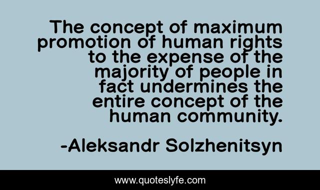 This page presents the quote "The concept of maximum promotion of human rights to the expense of the majority of people in fact undermines the entire concept of the human community.". Author of this quote is Aleksandr Solzhenitsyn. This quote is about human-rights, today-social-problems, truth, philosophy, world,.