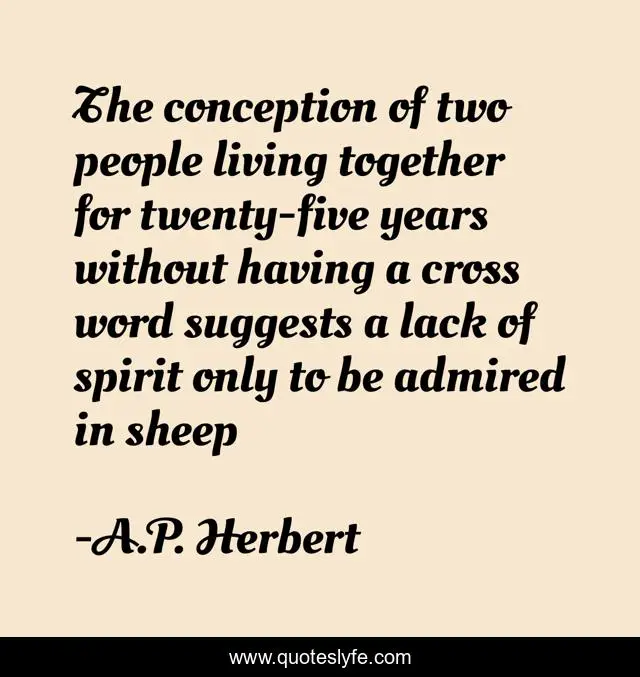 This page presents the quote "The conception of two people living together for twenty-five years without having a cross word suggests a lack of spirit only to be admired in sheep". Author of this quote is A.P. Herbert. This quote is about love, marriage, affection,.