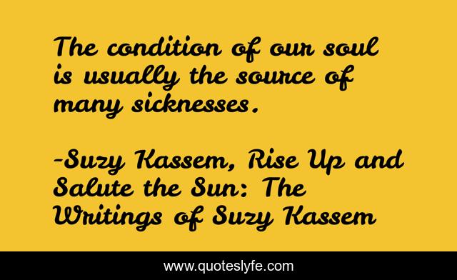 This page presents the quote "The condition of our soul is usually the source of many sicknesses.". Author of this quote is Suzy Kassem, Rise Up and Salute the Sun: The Writings of Suzy Kassem. This quote is about illness, sickness, science, soul, medicine, spirit,.