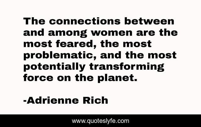 This page presents the quote "The connections between and among women are the most feared, the most problematic, and the most potentially transforming force on the planet.". Author of this quote is Adrienne Rich. This quote is about connections, force, between,.