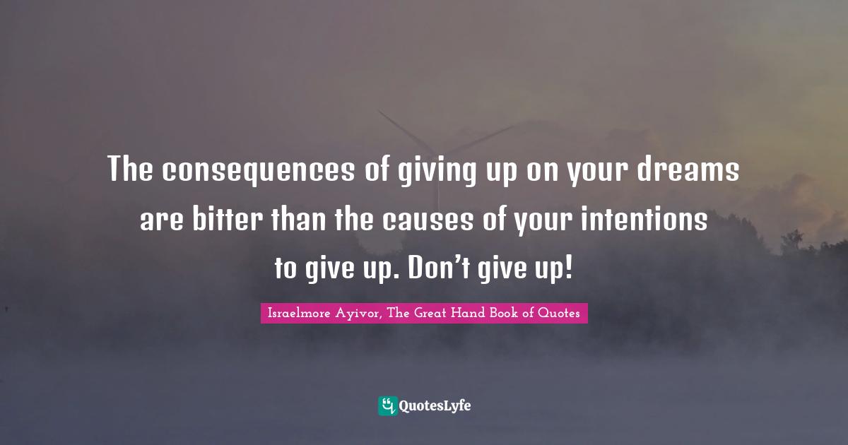 This page presents the quote "The consequences of giving up on your dreams are bitter than the causes of your intentions to give up. Don’t give up!". Author of this quote is Israelmore Ayivor, The Great Hand Book of Quotes. This quote is about food-for-thought, dream-big, consequences, intention, giving, big-dreams, causes, intentions, don-t-give-up,.