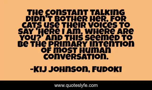 This page presents the quote "The constant talking didn't bother her, for cats use their voices to say 'here I am, where are you?' and this seemed to be the primary intention of most human conversation.". Author of this quote is Kij Johnson, Fudoki. This quote is about proverbial, insightful,.