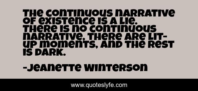 This page presents the quote "The continuous narrative of existence is a lie. There is no continuous narrative, there are lit-up moments, and the rest is dark.". Author of this quote is Jeanette Winterson. This quote is about life, darkness,.