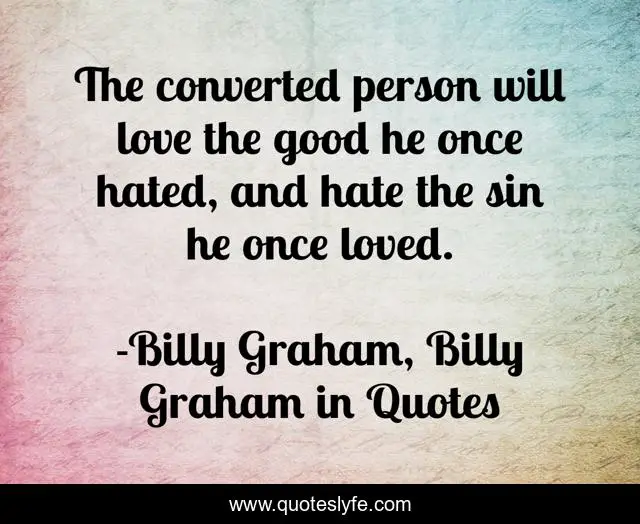 This page presents the quote "The converted person will love the good he once hated, and hate the sin he once loved.". Author of this quote is Billy Graham, Billy Graham in Quotes. This quote is about conversion, billy-graham,.