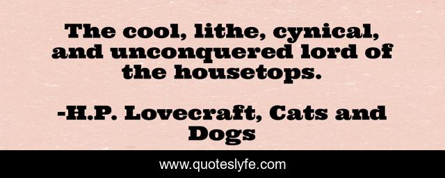 This page presents the quote "The cool, lithe, cynical, and unconquered lord of the housetops.". Author of this quote is H.P. Lovecraft, Cats and Dogs. This quote is about cats, cats-vs-dogs,.