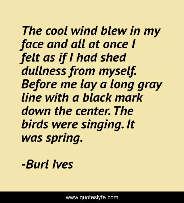 This page presents the quote "The cool wind blew in my face and all at once I felt as if I had shed dullness from myself. Before me lay a long gray line with a black mark down the center. The birds were singing. It was spring.". Author of this quote is Burl Ives. This quote is about spring, myself, cool,.
