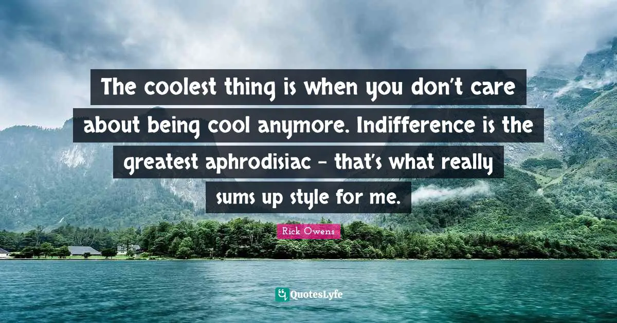 This page presents the quote "The coolest thing is when you don’t care about being cool anymore. Indifference is the greatest aphrodisiac - that’s what really sums up style for me.". Author of this quote is Rick Owens. This quote is about indifference, care, aphrodisiac, style, being cool,.