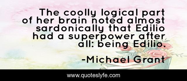 This page presents the quote "The coolly logical part of her brain noted almost sardonically that Edilio had a superpower after all: being Edilio.". Author of this quote is Michael Grant. This quote is about superpowers, light, astrid-ellison, edilio, astrid, fayz,.