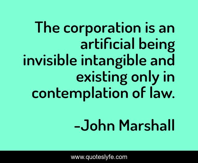 This page presents the quote "The corporation is an artificial being invisible intangible and existing only in contemplation of law.". Author of this quote is John Marshall. .