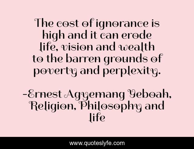 This page presents the quote "The cost of ignorance is high and it can erode life, vision and wealth to the barren grounds of poverty and perplexity.". Author of this quote is Ernest Agyemang Yeboah, Religion, Philosophy and life. This quote is about thought, confusion, choices, ignorance, living-life,.