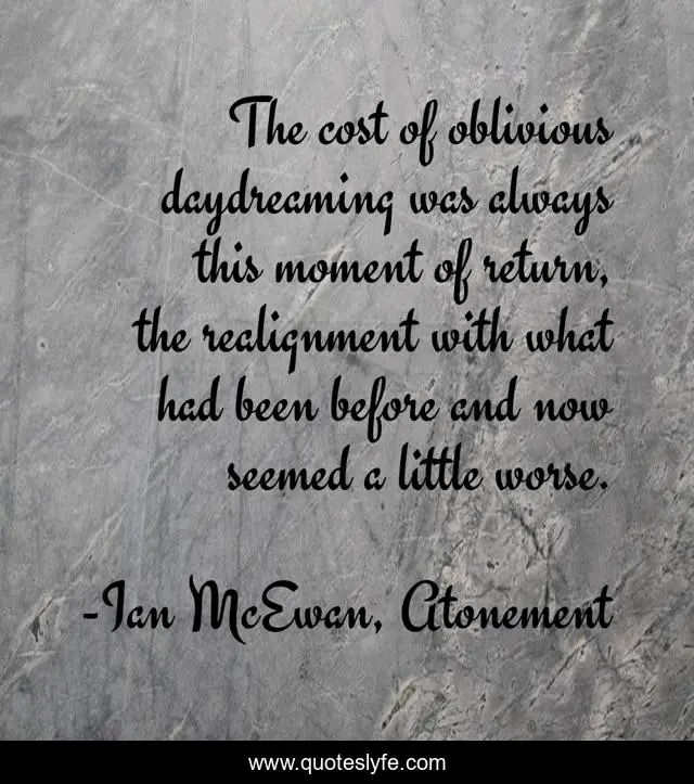 This page presents the quote "The cost of oblivious daydreaming was always this moment of return, the realignment with what had been before and now seemed a little worse.". Author of this quote is Ian McEwan, Atonement. This quote is about fantasy, daydreaming, life, dreams, imagination,.