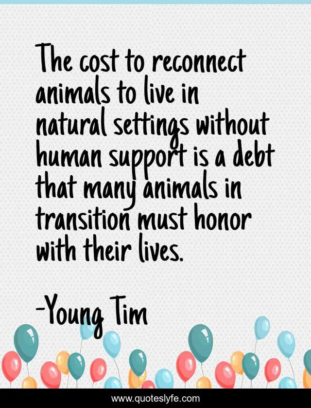 This page presents the quote "The cost to reconnect animals to live in natural settings without human support is a debt that many animals in transition must honor with their lives.". Author of this quote is Young Tim. This quote is about farm-life, farming, animals,.