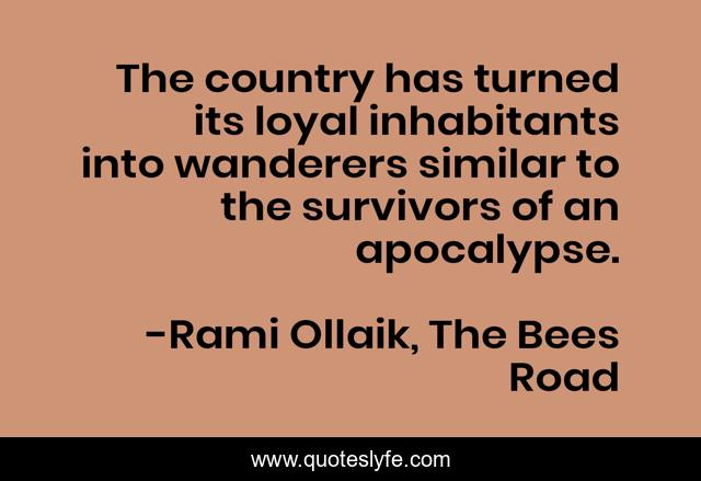 This page presents the quote "The country has turned its loyal inhabitants into wanderers similar to the survivors of an apocalypse.". Author of this quote is Rami Ollaik, The Bees Road. This quote is about survivors, country, apocalypse, loyalty,.