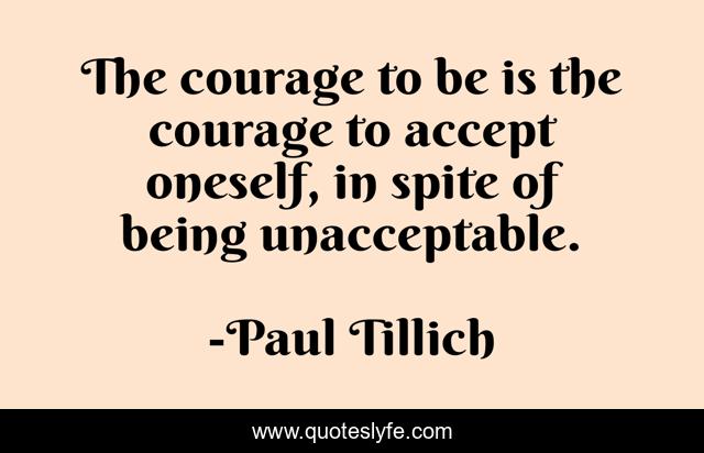 This page presents the quote "The courage to be is the courage to accept oneself, in spite of being unacceptable.". Author of this quote is Paul Tillich. This quote is about being, oneself, accept,.