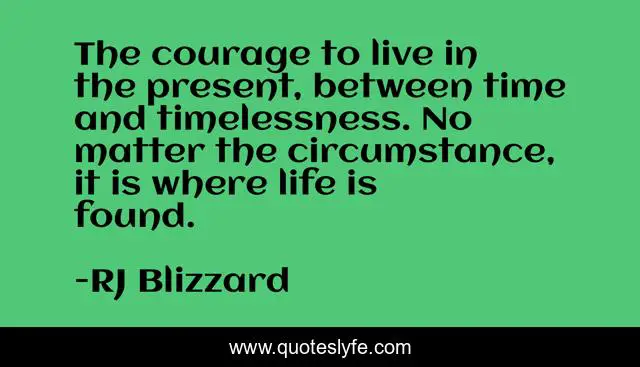This page presents the quote "The courage to live in the present, between time and timelessness. No matter the circumstance, it is where life is found.". Author of this quote is RJ Blizzard. This quote is about life-philosophy, courage, timeless, time,.