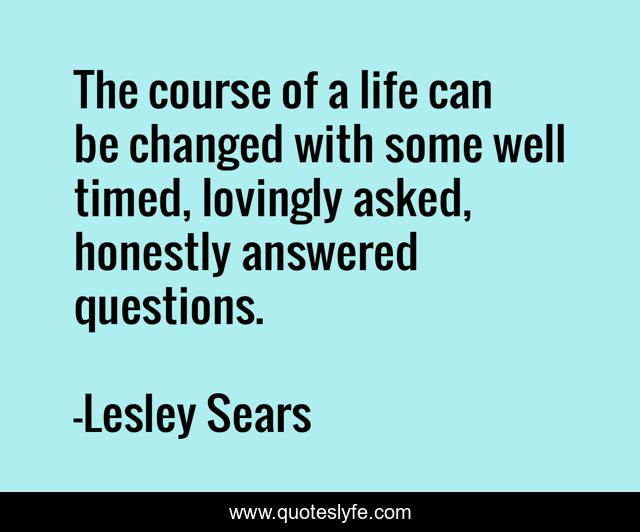 This page presents the quote "The course of a life can be changed with some well timed, lovingly asked, honestly answered questions.". Author of this quote is Lesley Sears. This quote is about faith, bible, love, god, jesus, inspirational, enthusiasm, wisdom, affection,.