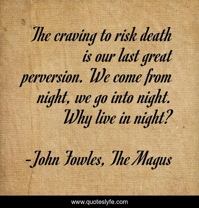 This page presents the quote "The craving to risk death is our last great perversion. We come from night, we go into night. Why live in night?". Author of this quote is John Fowles, The Magus. .