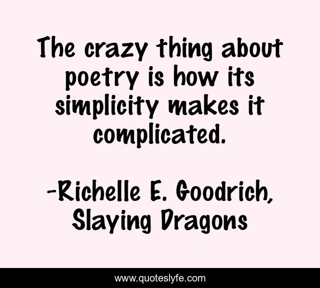 This page presents the quote "The crazy thing about poetry is how its simplicity makes it complicated.". Author of this quote is Richelle E. Goodrich, Slaying Dragons. This quote is about author, poetry, writing, richelle, words, richelle-goodrich,.