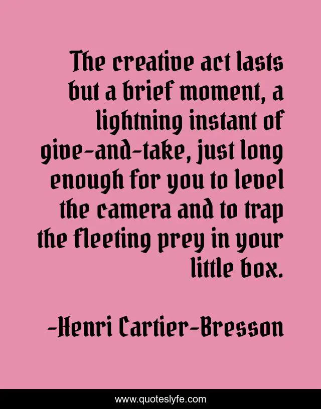 This page presents the quote "The creative act lasts but a brief moment, a lightning instant of give-and-take, just long enough for you to level the camera and to trap the fleeting prey in your little box.". Author of this quote is Henri Cartier-Bresson. This quote is about moment, long, creative,.