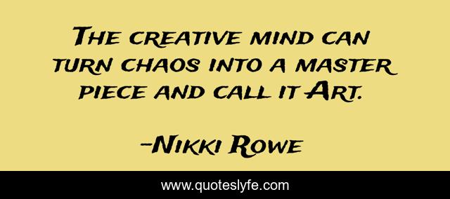 This page presents the quote "The creative mind can turn chaos into a master piece and call it Art.". Author of this quote is Nikki Rowe. This quote is about wise-words, art, words-of-wisdom, artist, freedom, inspirational, nikki-rowe, enthusiasm, words,.