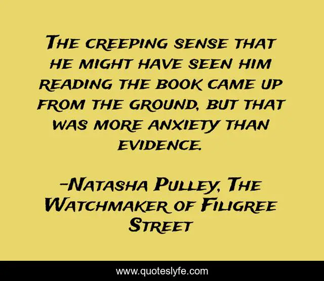 This page presents the quote "The creeping sense that he might have seen him reading the book came up from the ground, but that was more anxiety than evidence.". Author of this quote is Natasha Pulley, The Watchmaker of Filigree Street. This quote is about natasha-pulley, anxiety,.