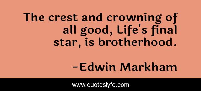 This page presents the quote "The crest and crowning of all good, Life's final star, is brotherhood.". Author of this quote is Edwin Markham. This quote is about life, star, brotherhood,.