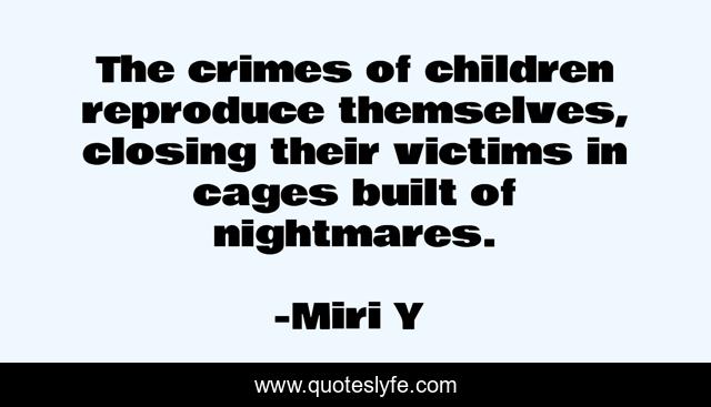 This page presents the quote "The crimes of children reproduce themselves, closing their victims in cages built of nightmares.". Author of this quote is Miri Yū. This quote is about nightmares, crimes, children, cages,.