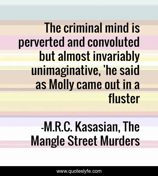 This page presents the quote "The criminal mind is perverted and convoluted but almost invariably unimaginative, 'he said as Molly came out in a fluster". Author of this quote is M.R.C. Kasasian, The Mangle Street Murders. This quote is about detective, crime,.