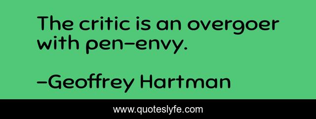 This page presents the quote "The critic is an overgoer with pen-envy.". Author of this quote is Geoffrey Hartman. This quote is about critics, criticism,.