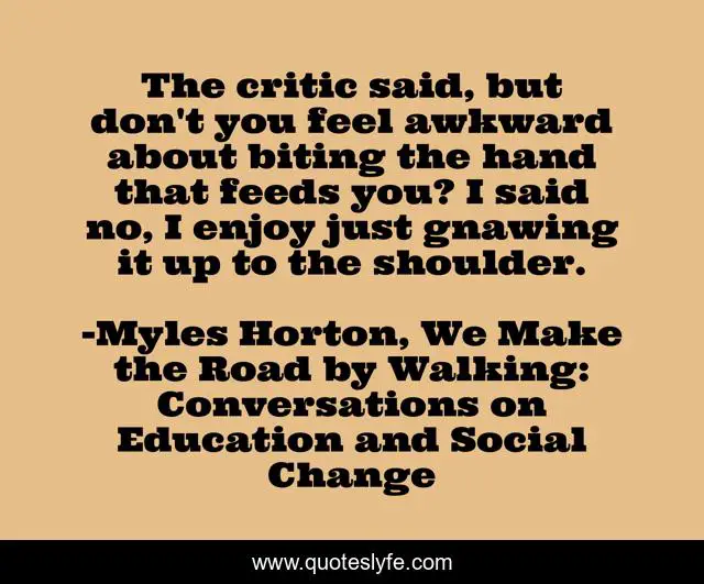 This page presents the quote "The critic said, but don't you feel awkward about biting the hand that feeds you? I said no, I enjoy just gnawing it up to the shoulder.". Author of this quote is Myles Horton, We Make the Road by Walking: Conversations on Education and Social Change. This quote is about radicalism, funding, independence,.