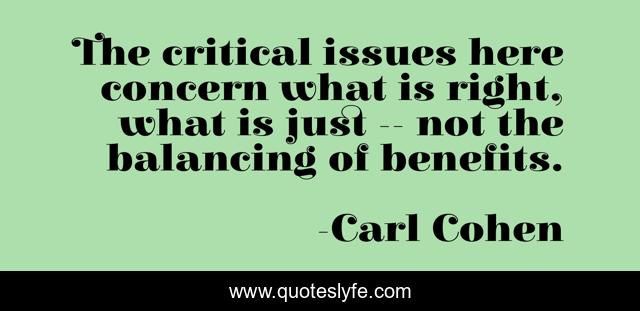 This page presents the quote "The critical issues here concern what is right, what is just -- not the balancing of benefits.". Author of this quote is Carl Cohen. This quote is about justice, experimentation, benefits, issues, prison,.