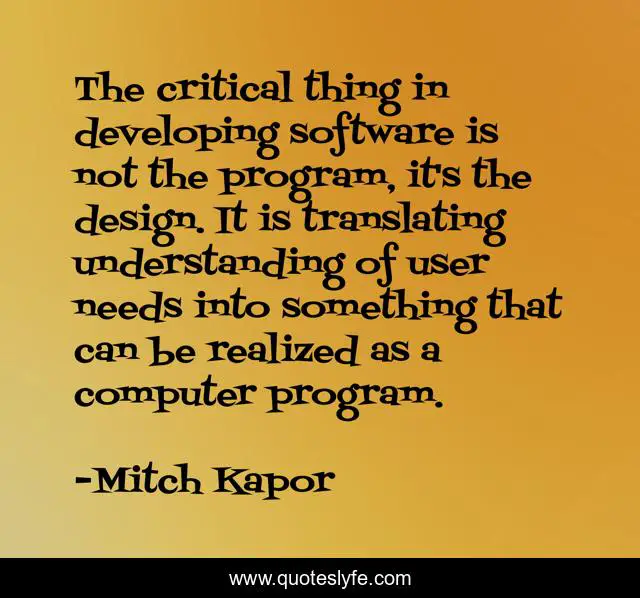 This page presents the quote "The critical thing in developing software is not the program, it's the design. It is translating understanding of user needs into something that can be realized as a computer program.". Author of this quote is Mitch Kapor. This quote is about understanding, software,.