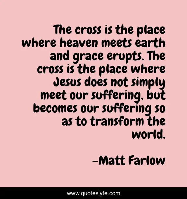 This page presents the quote "The cross is the place where heaven meets earth and grace erupts. The cross is the place where Jesus does not simply meet our suffering, but becomes our suffering so as to transform the world.". Author of this quote is Matt Farlow. This quote is about grace, cross, jesus, suffering-of-humanity, transformation, cross-of-christ,.