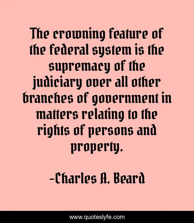 This page presents the quote "The crowning feature of the federal system is the supremacy of the judiciary over all other branches of government in matters relating to the rights of persons and property.". Author of this quote is Charles A. Beard. This quote is about matters, property, rights,.